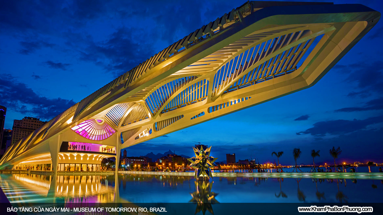 Bảo tàng của Ngày mai được thiết kế bởi kiến trúc sư Santiago Calatrava, theo trường phái kiến trúc tương lai.Bảo tàng nằm biệt lập hoàn toàn trên một dải đất lấn biển trong vịnh Guanabara, chi phí xây dựng khoảng $60 triệu USD.Ngày 17/12/2015, Tổng thống Brazil đã cắt băng khánh thành Museum of Tomorrow, ngay lập tức đã trở thành một điểm đến nổi bật tại Rio De Janeiro.Một số nhận xét vui cho rằng, bảo tàng giống như một con khủng long đang ngậm máy điều hòa, còn với kiến trúc sư Santiago Calatrava, ông nói mình lấy cảm hứng từ một loài hoa tại Brazil.Công trình này tiết kiệm được đến 40% điện năng, nhờ sự kết hợp giữa ánh sáng tự nhiên, năng lượng mặt trời, hệ thống thông gió, hệ thống làm mát từ dòng nước dưới vịnh Guanabara.Bảo tàng mở cửa vào thứ 5 hàng tuần, và luôn có một số lượng khổng lồ khách tham quan chờ trước cửa.Ánh sáng luôn chan hòa, tràn ngập bên trong bảo tàng, nổi bật lên vẻ đẹp của kiến trúc hiện đại…Bảo tàng của Ngày mai không thiên về trưng bày hiện vật, nó tập trung vào vấn đề cốt lõi – Hiện trạng của trái đất trước sự tác động con người – Tương lai sắp tới sẽ ra sao – Làm gì để tạo ra thay đổi tích cực.Những thông tin, hình ảnh, âm thanh được thể hiện trên màn hình cảm ứng sinh động, khách tham quan tương tác để hiểu thêm về sự tác động qua lại giữa con người và thiên nhiên.Một căn phòng được sắp đặt ấn tượng, giúp truyền tải những thông điệp mạnh mẽ hơn.Bảo tàng của Ngày mai – khi màn đêm buông xuống…